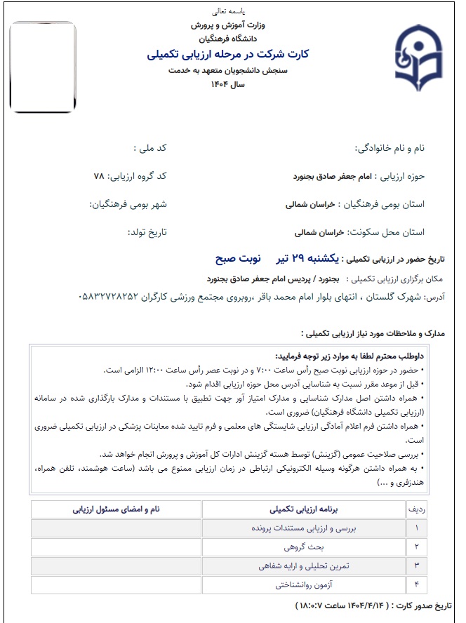 لذا، ضروری است داوطلبان نسبت به بررسی و ملاحظة مداوم سامانه ارزیابی تکمیلی و اطلاعیه های مندرج در آن دقت و مراقبت ویژه داشته باشند. | cntolo1378.blogfa.com #کافی نت# طلوع 09338303369 ارائه خدمات به سراسر کشور24ساعت آنلاین برخط و حضوری یکشنبه یکم تیر ۱۴۰۴ :: 15:37 :: نويسنده : کافی نت طلوع