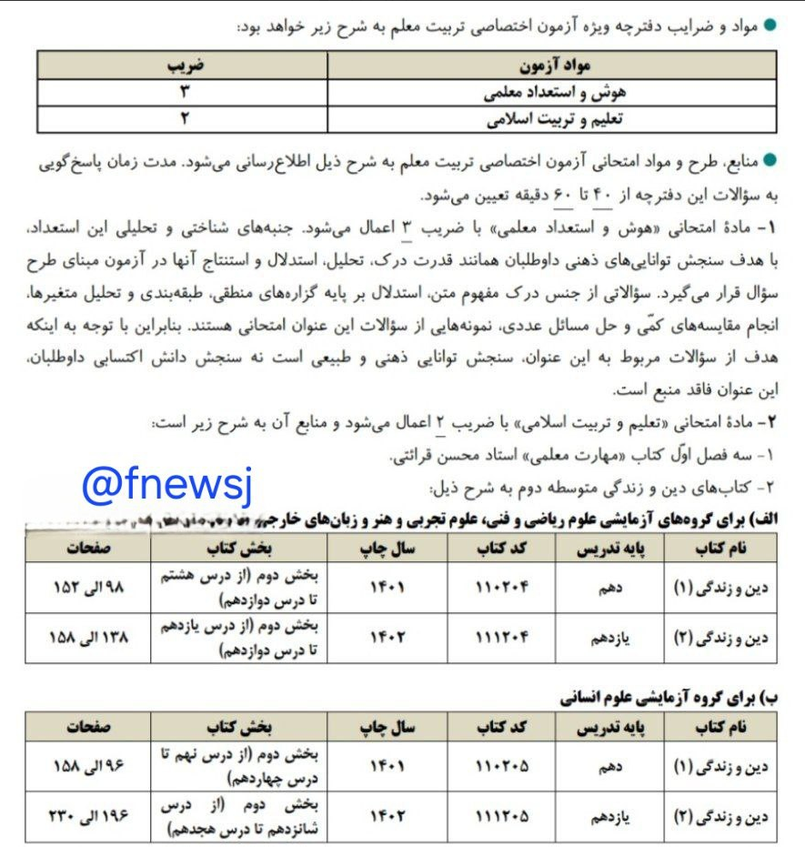 📅فقط اردیبهشتماه: نوبت برگزاری کنکور 📊تاثیر نمرات نهایی: 🔸سوابق تحصیلی: ۵۰٪ 🔸مصاحبه: ۲۵٪ 🔸دفترچه سراسری: ۱۵٪ 🔸دفترچه فرهنگیان: ۱۰٪ 📚مواد اختصاصی: ❕هوش معلمی: ضریب ۳ 📖 تعلیم و تربیت اسلامی: ضریب ۲ 👨🏫منابع: 🔹 "مهارت معلمی" (۳ فصل اول) 🔹 دینی ۱ (درس ۸-۱۲) و دینی ۲ (درس ۱۱-۱۲) 🚨نکات مهم: 💠مصاحبه: ملاک دعوت تراز کنکور (۵۰۰۰+) 💠پذیرش نهایی: نمره مصاحبه ۵۰٪+ 💠انصراف سریع: انتخاب رشته سراسری ممنوع مگر با انصراف پس از نتیجه مصاحبه! 📆 اعتبار مصاحبه: تا آزمون ۱۴۰۵ با درخواست رسمی