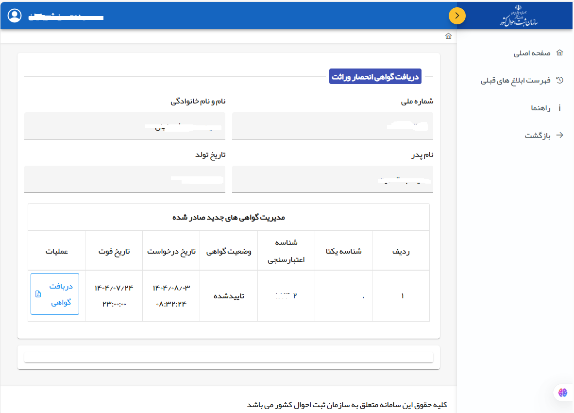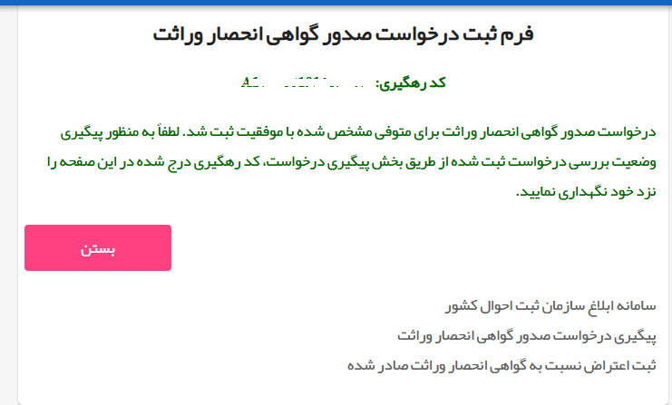 نمونه کار درخواست انحصار وراثت و دریافت نکته قبل از درخواست انحصار وراثت باید به سازمان ثبت احوال مراجعه نموده و روال اداری طی شده باشد سپس از طریق سامانه درخواست ودریافت انجام می شود.