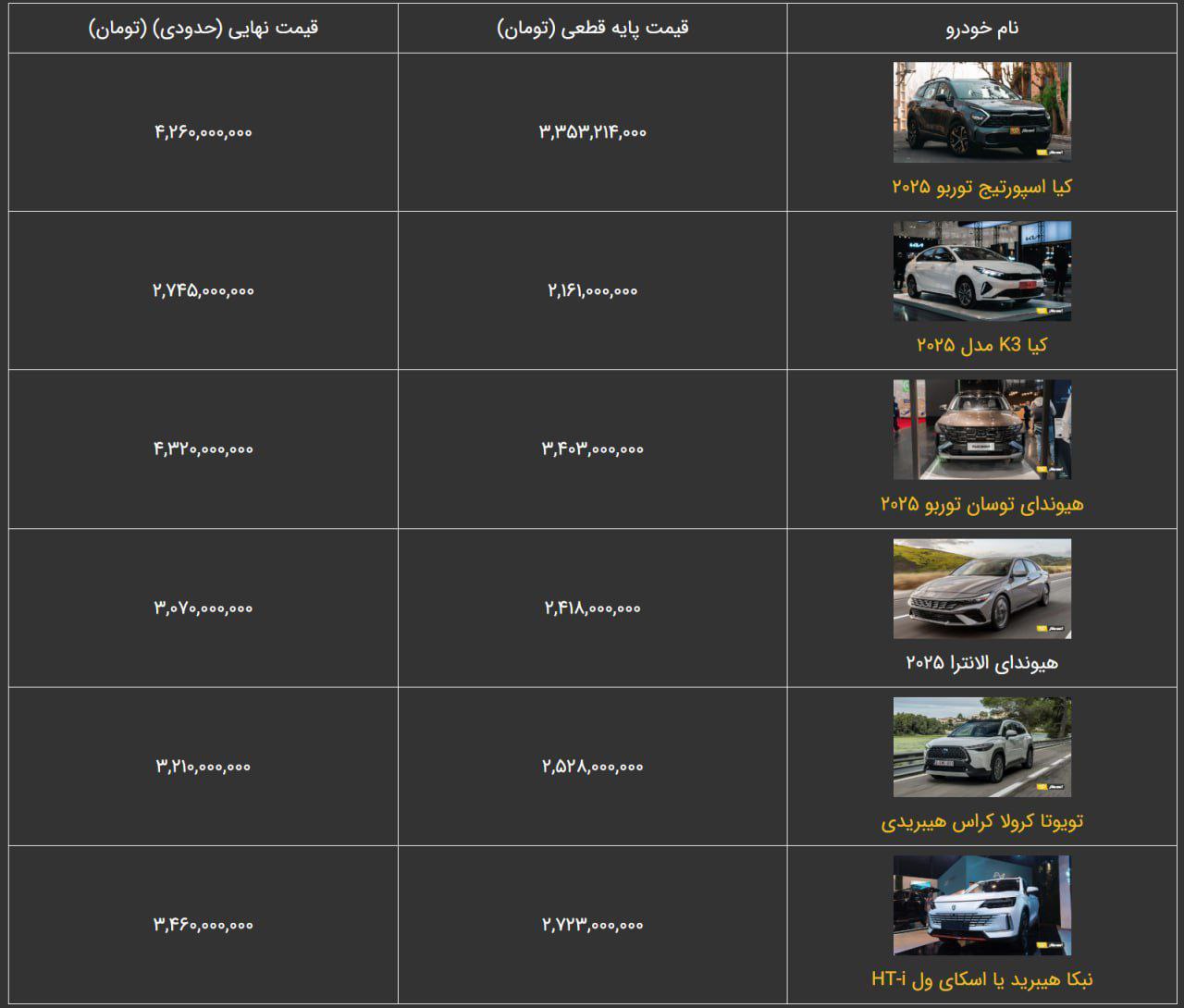 قیمت نهایی خودروهای وارداتی ویژه آذر ماه ۱۴۰۴