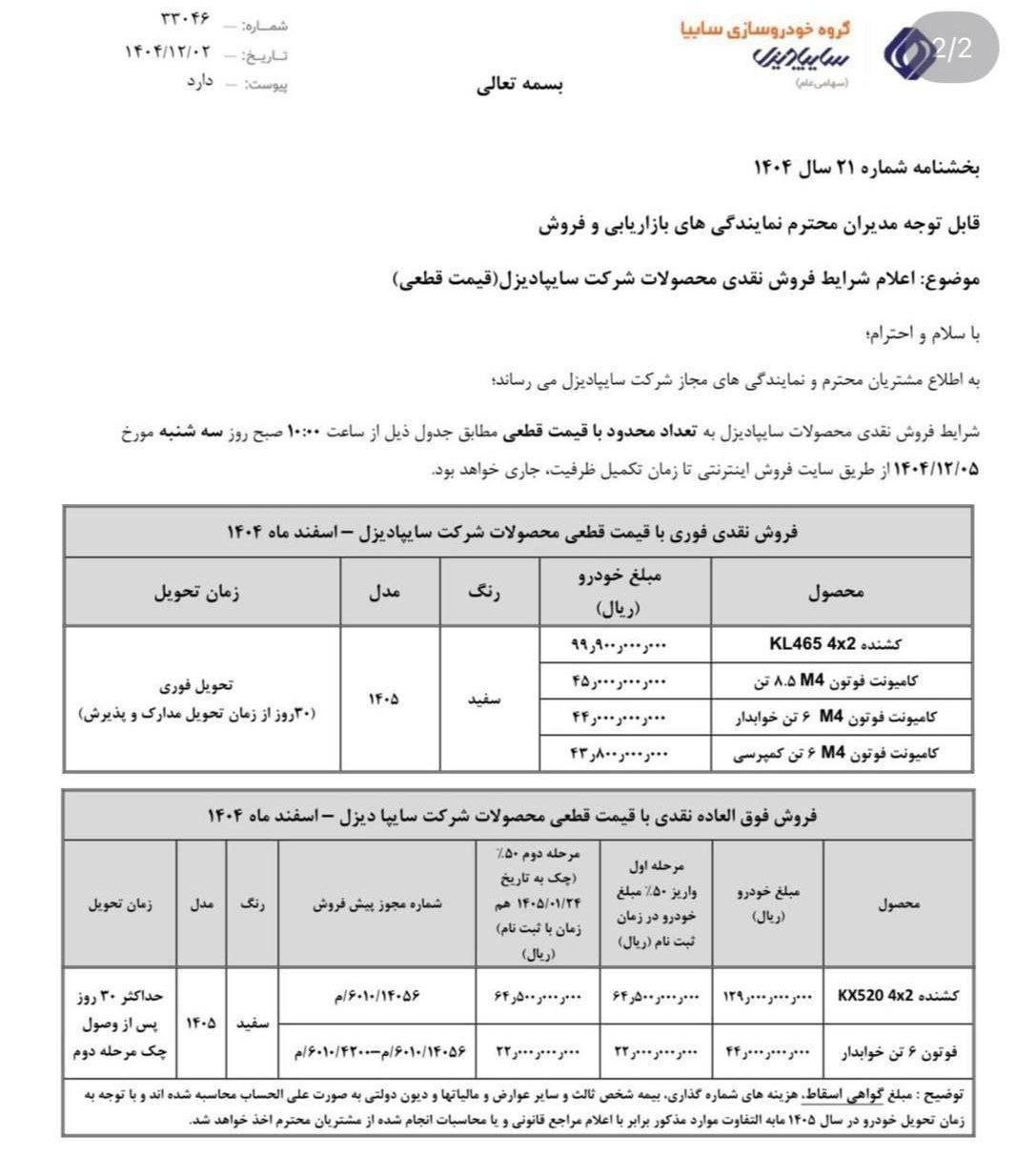 علام شرایط فروش نقدی محصولات شرکت سایپا دیزل با قیمت قطعی